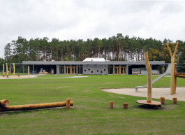 This low-rise building made of wood is grouped around a central active zone, the heart of the kindergarten. Around this center are the game areas, which at the same time offer space for arrival, cloakrooms and free play. The enclosed small-group rooms are divided according to age; around the outside and between the group rooms is a covered terrace area which serves as a transition space between inside and outside.