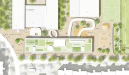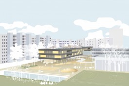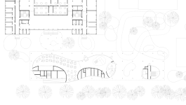 Die gesamte Erdgeschossebene wird als optisch zusammenhängender Ort der Pause & Erholung ausgebildet. Mit sanft geschwungenen Formen wird Raum für die Mensa und den Pausenhof geschaffen. Die beiden Obergeschosse bilden darüber ein schützendes Dach – gleichsam als „fliegende Klassenzimmer“.